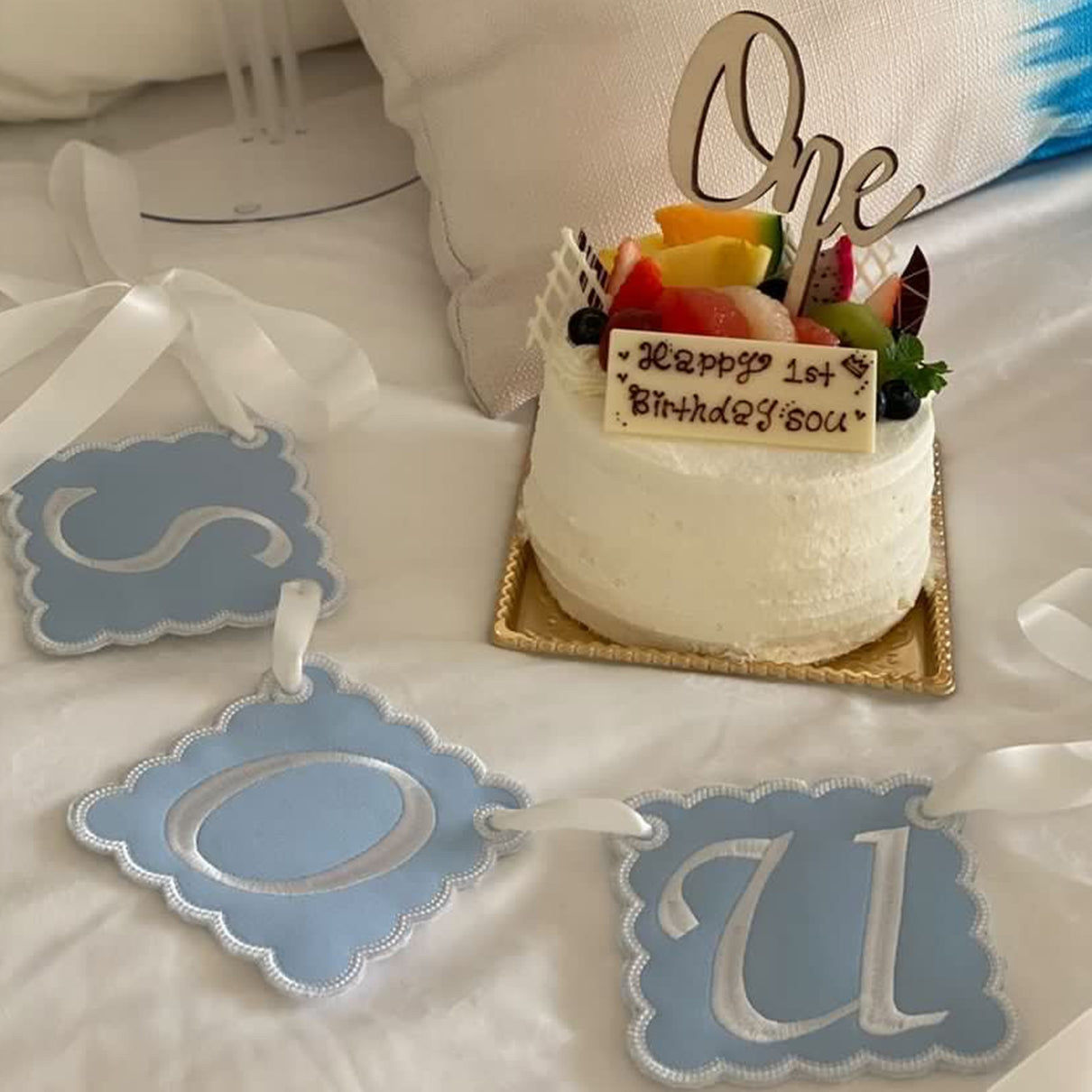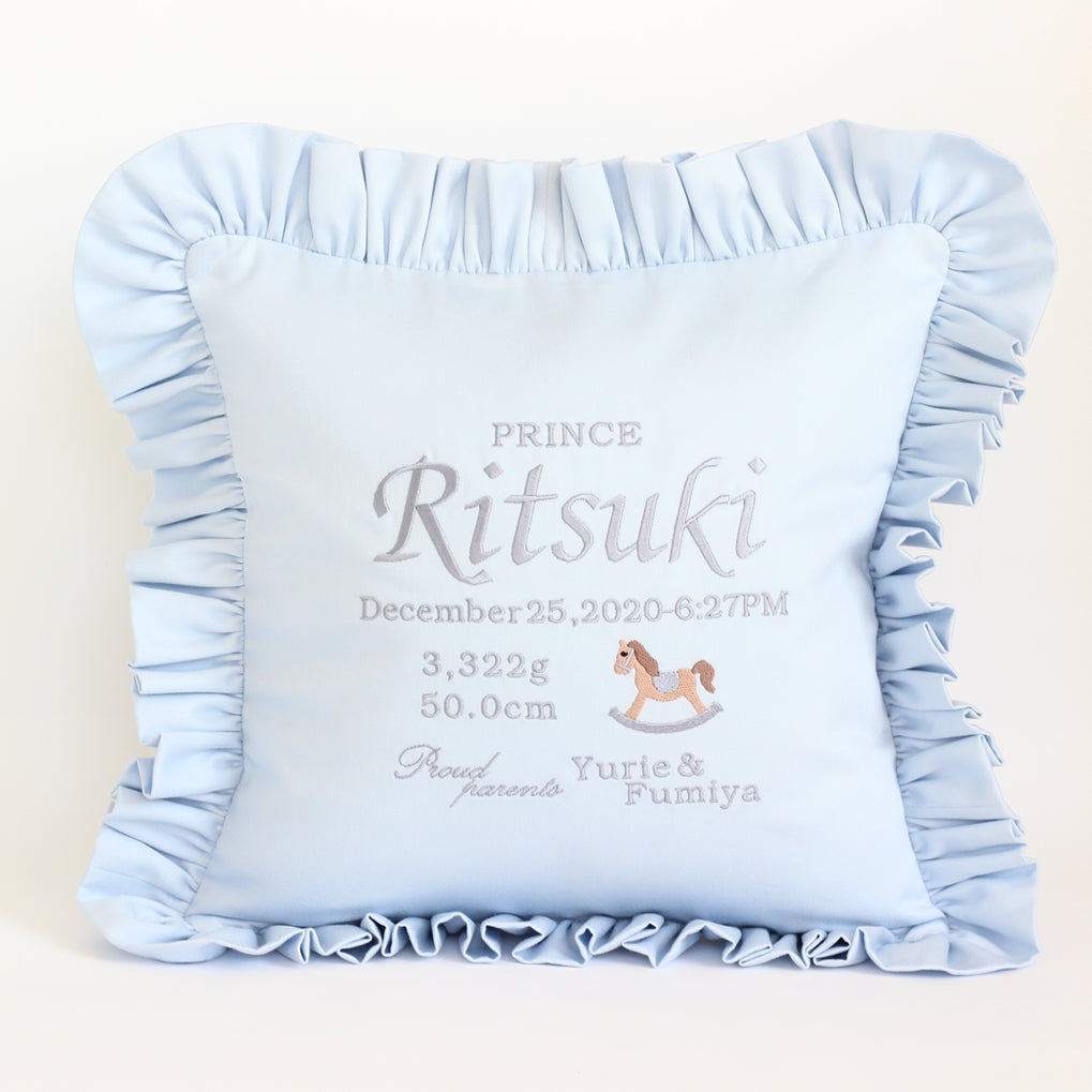 ベビーちゃんのお名前や出生の記録を刺繍したアニバーサリークッション
