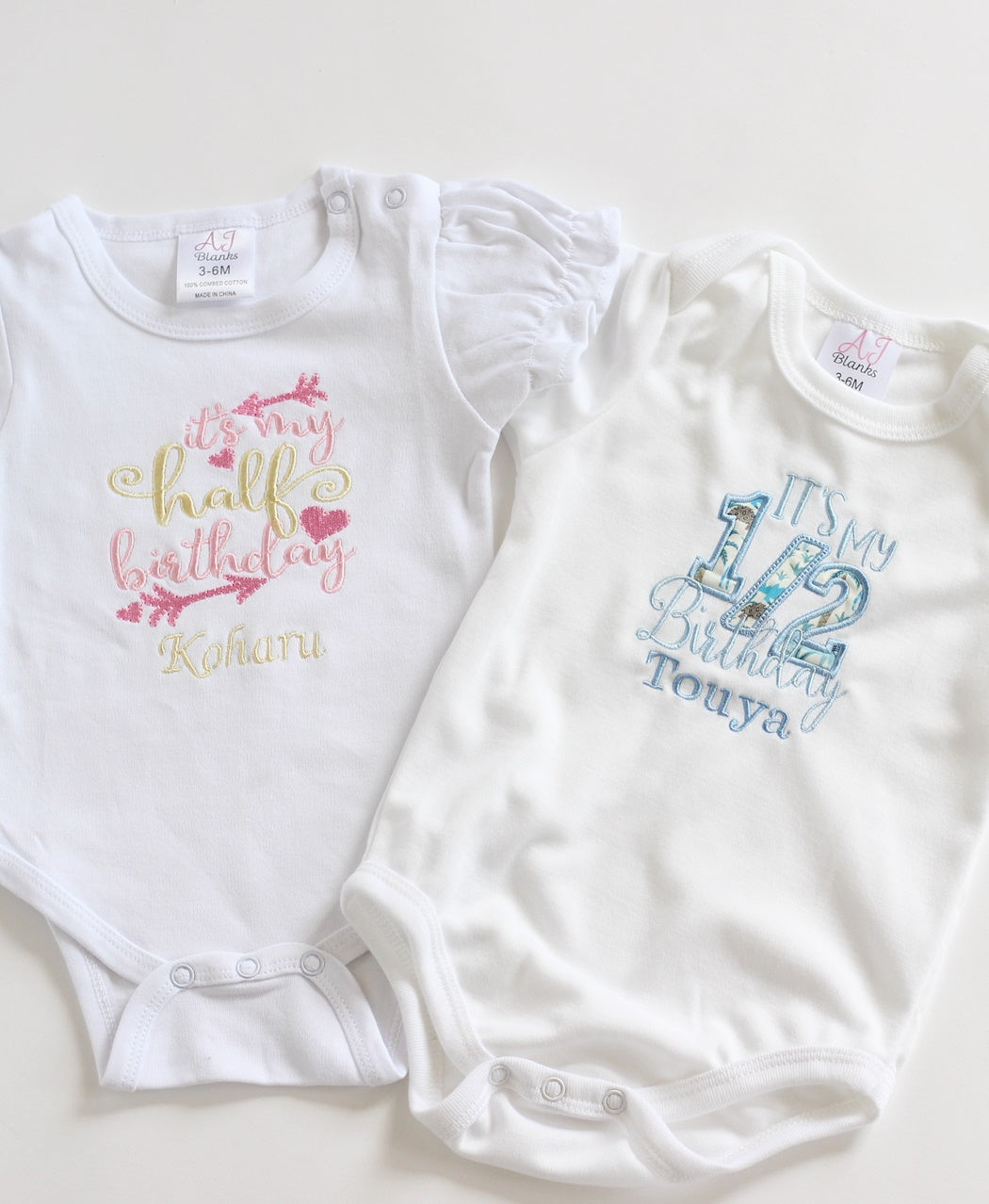 6か月目のハーフバースデーのお祝いに華やかな刺繍のハーフバースデーロンパース。リバティ生地のアップリケバージョンとデザインがかわいい刺繍バージョンの2パターンをご用意しました。