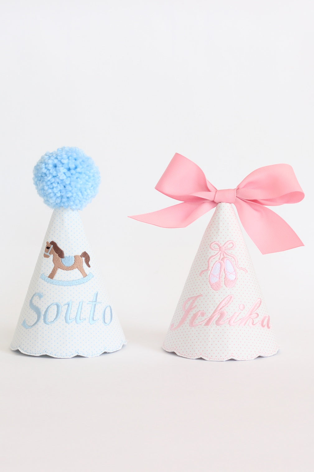 パウダーブルー、パウダーピンク、ホワイト、シャンパングレーの巾着袋にお好きなモチーフとお名前を刺繍いたします。