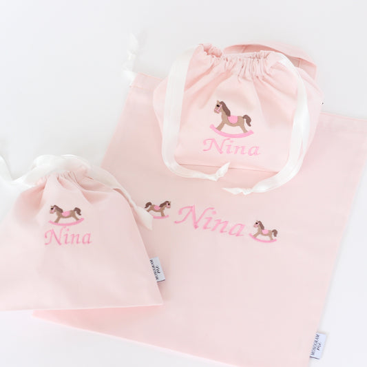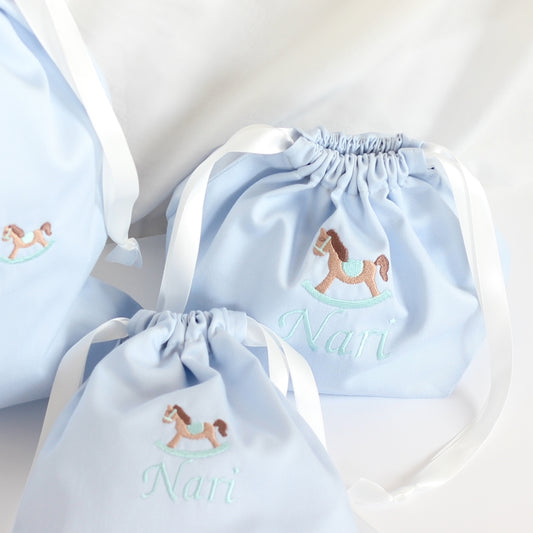 【ロッキングホース+名入れ刺繍】巾着袋3種類セット(4色)