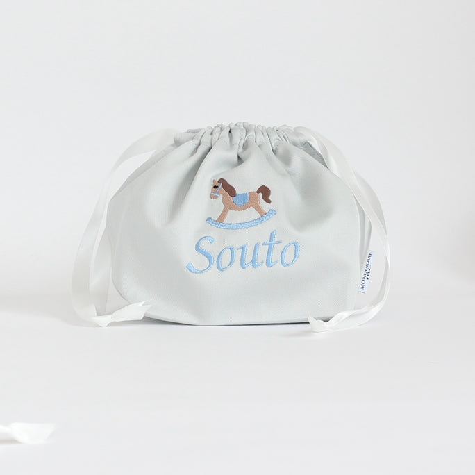 ブルー、ピンク、グレーのギンガムチェックの巾着袋にお好きなモチーフとお名前を刺繍します。