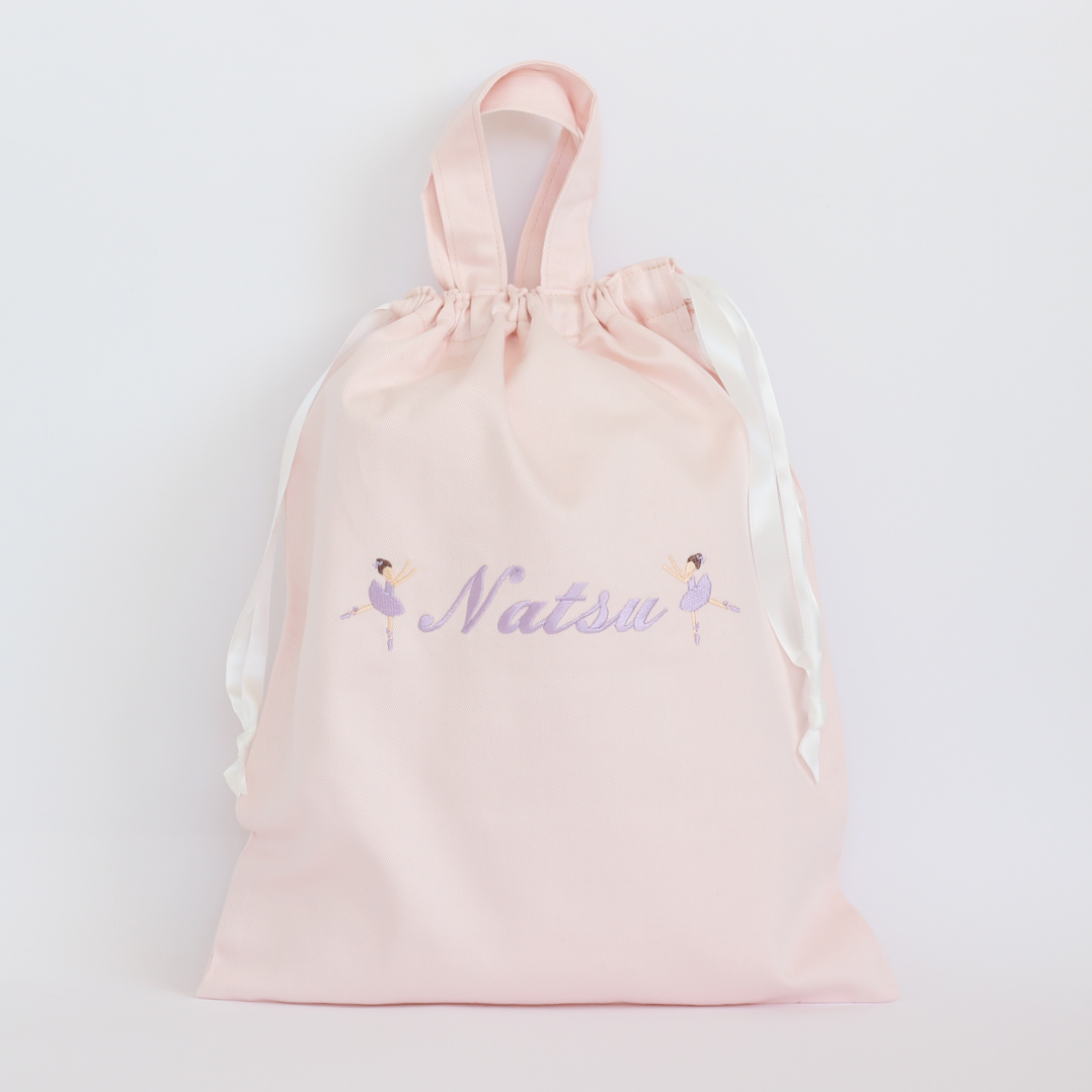 柔らかなツイル生地と両面サテンリボンの巾着に踊るバレリーナちゃんとお名前を刺繍します。