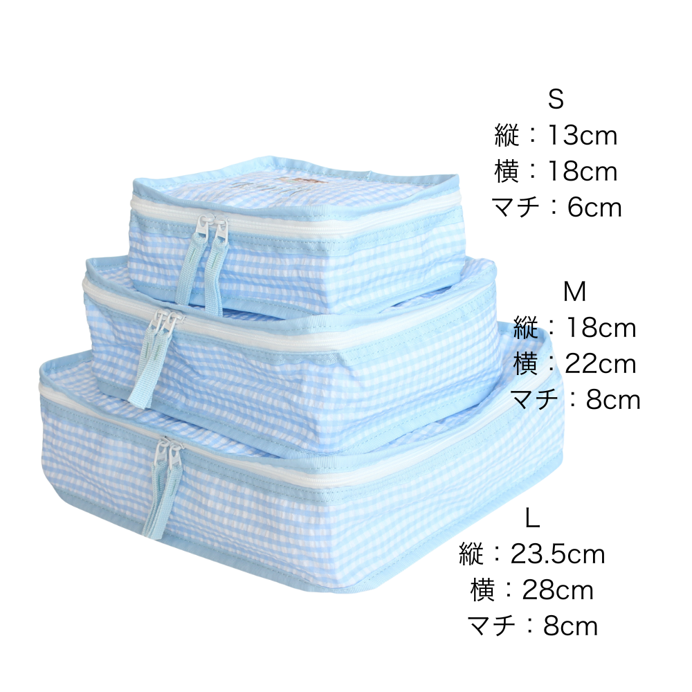 さわやかなブルーチェックのシアサッカー生地のスタッキングポーチ3点セットです。
