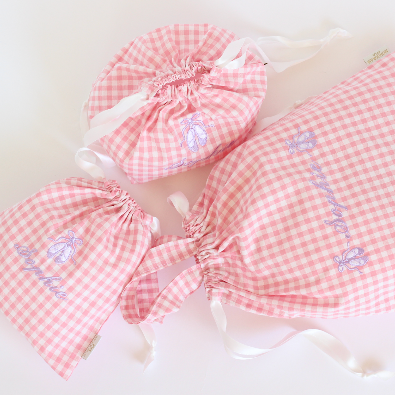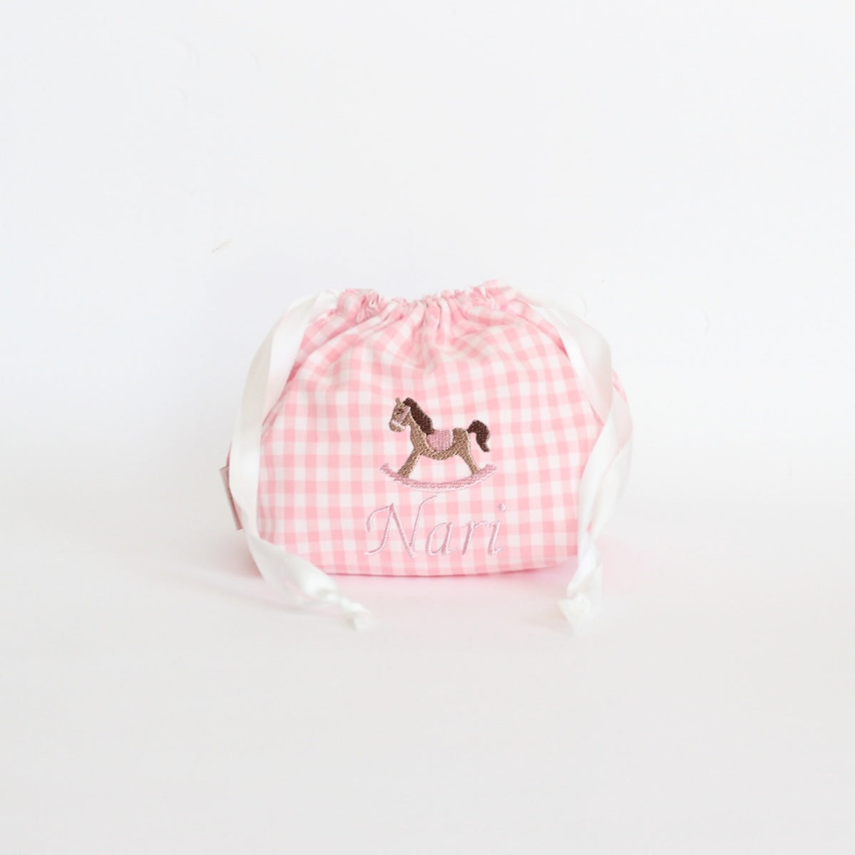 お好きなモチーフとお名前刺繍入りドローストリングバッグ3種類セット チェック柄ピンク