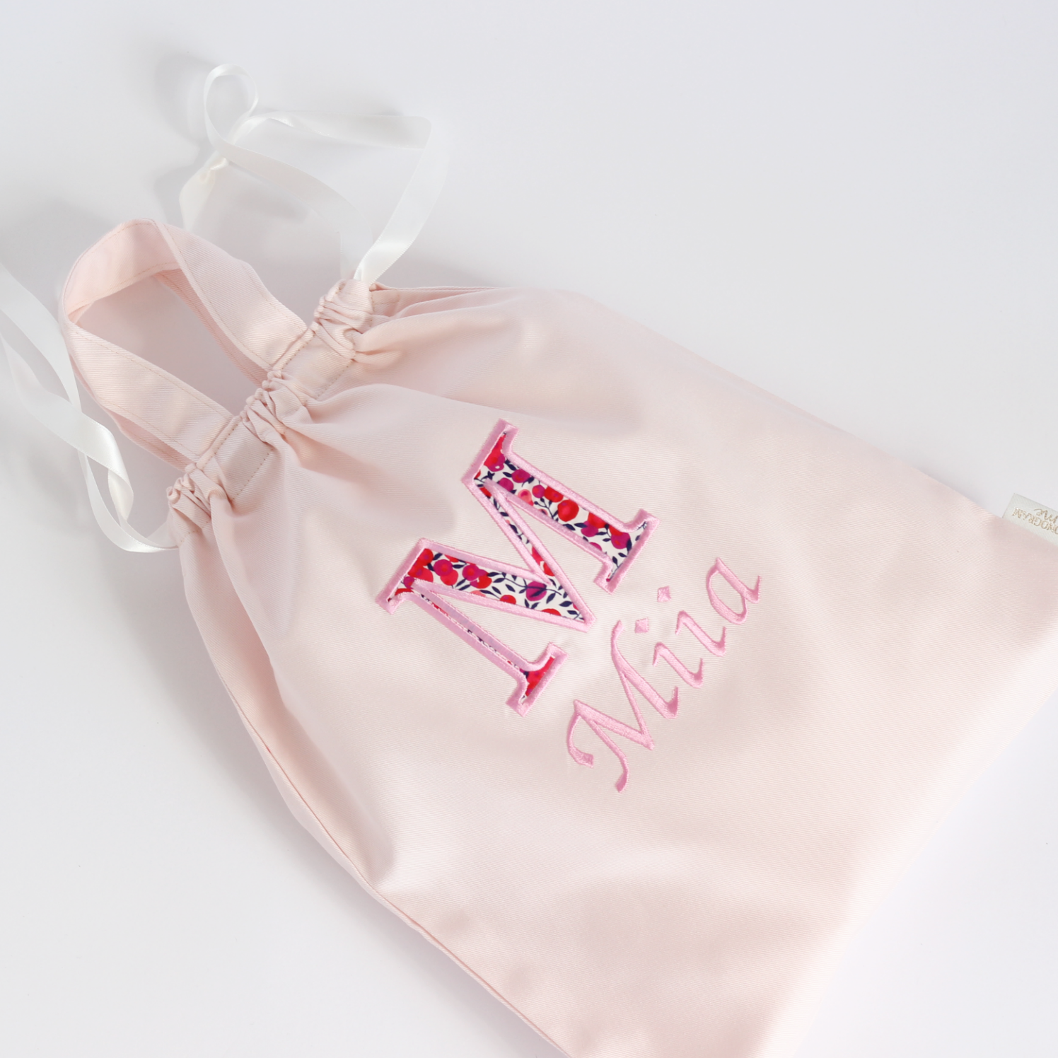 柔らかなツイル生地に両面サテンリボンを通した巾着にリバティファブリックでイニシャルをアップリケし、お名前を刺繍します。