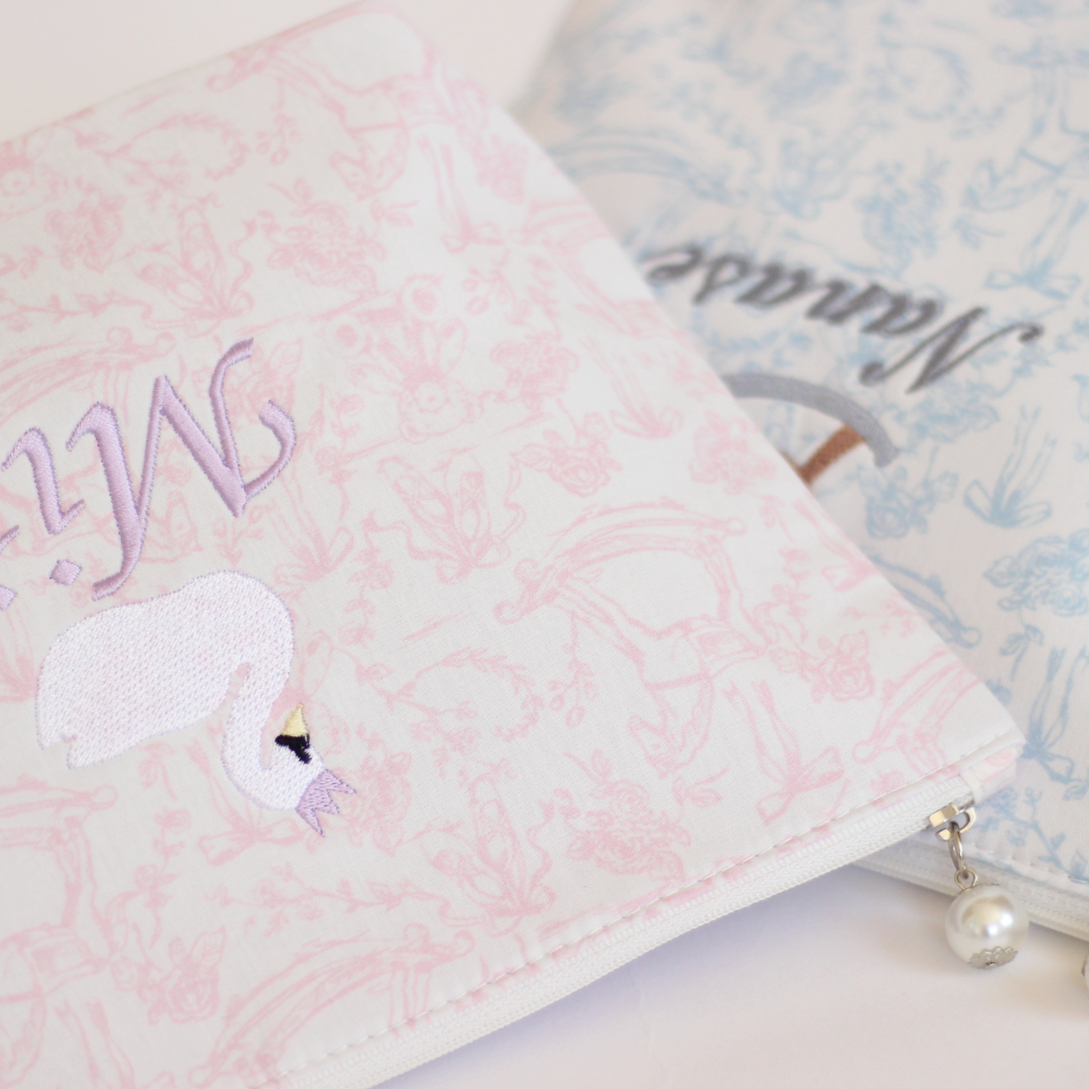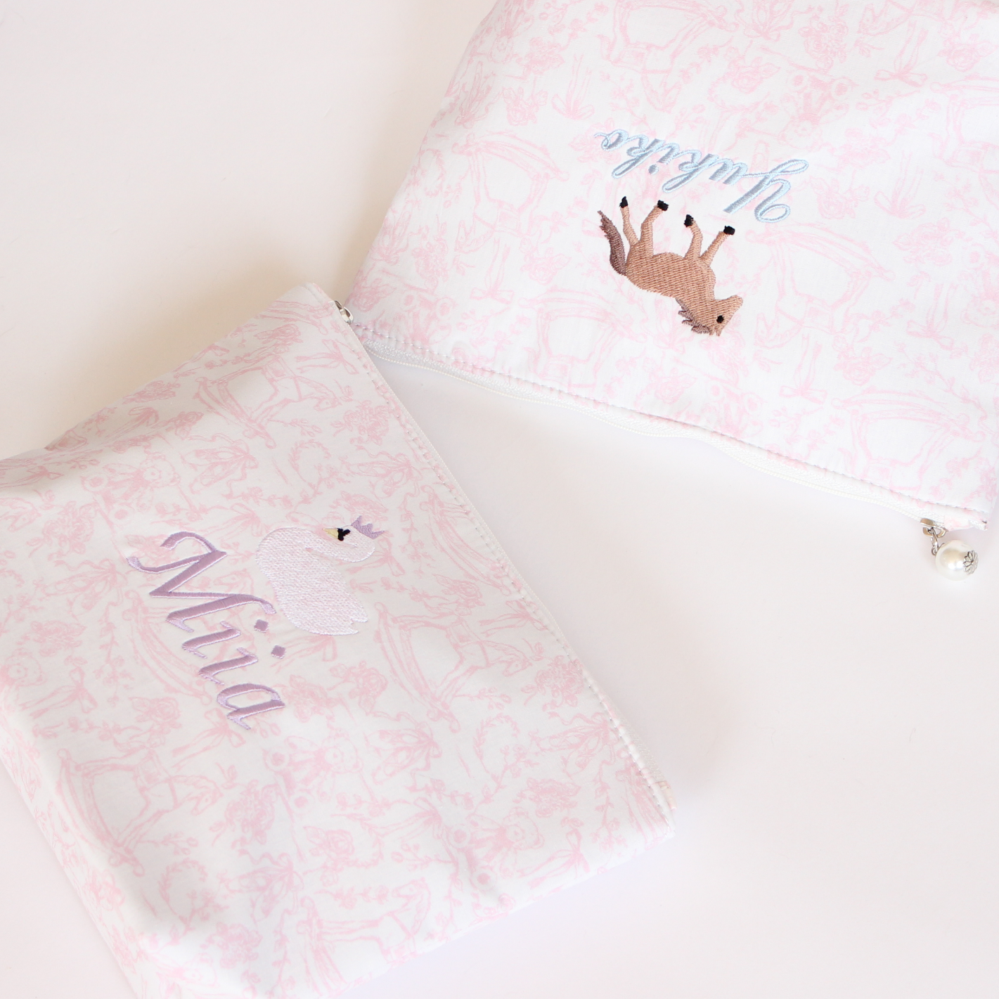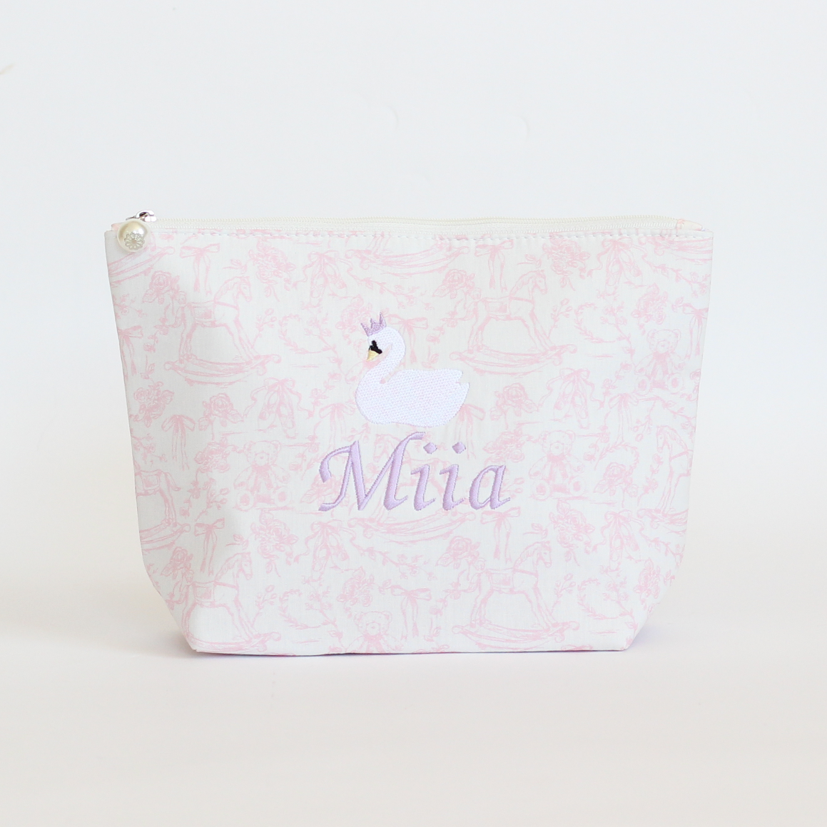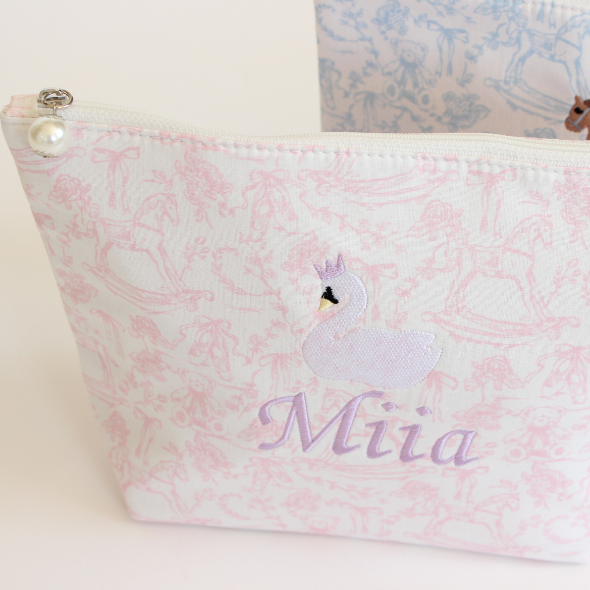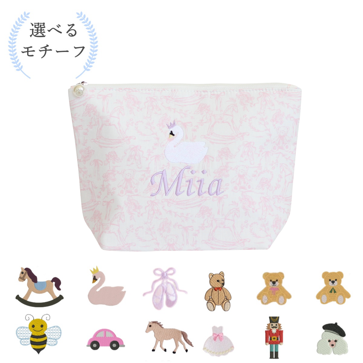 当店で人気のロッキングホースやトゥーシューズ、くまちゃんモチーフがイラストされたオリジナルのToile de Jouy (トワルドジュイ)柄のポーチです。