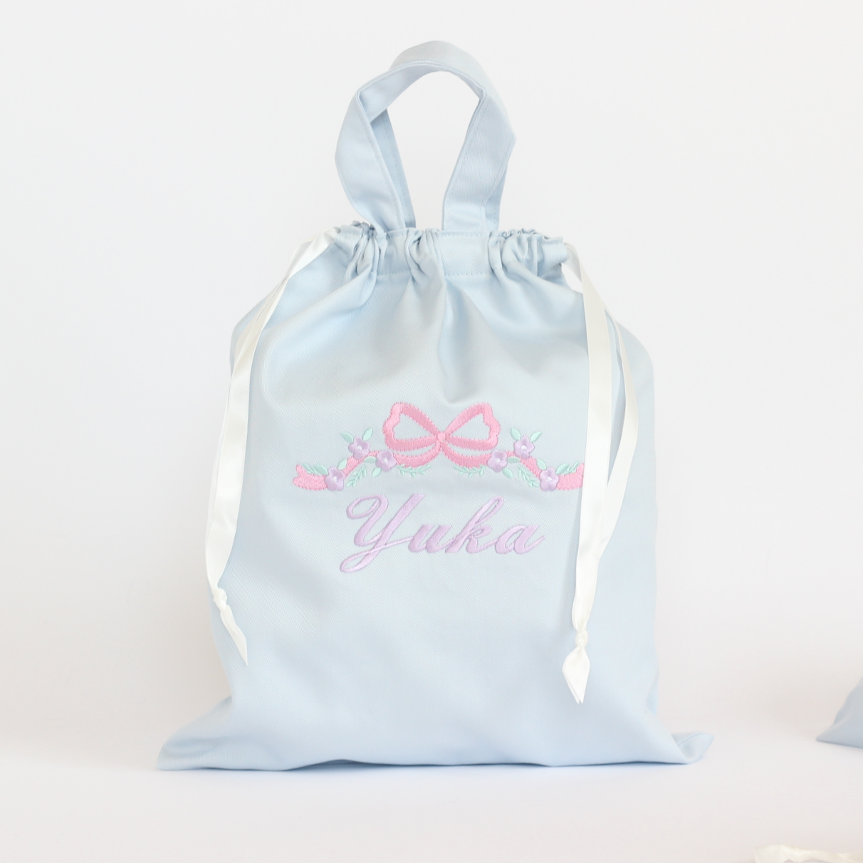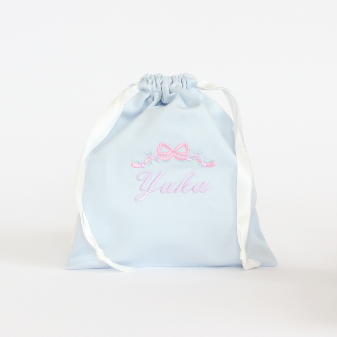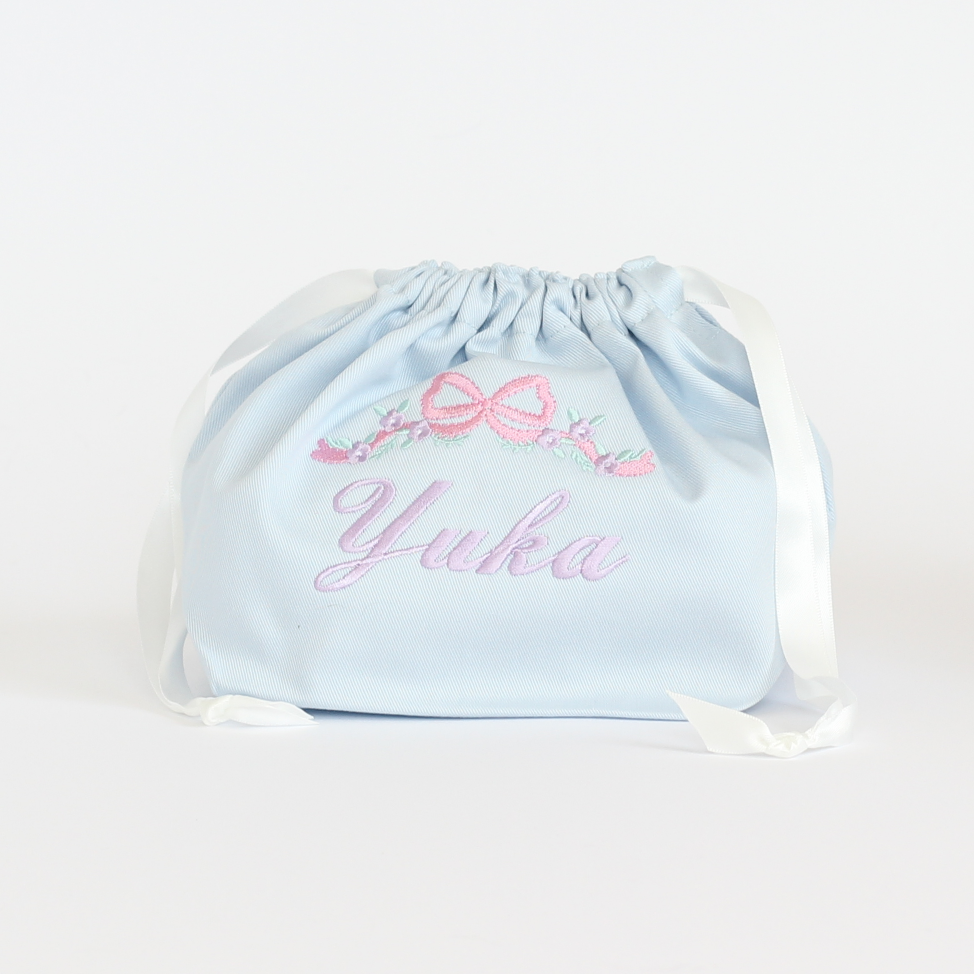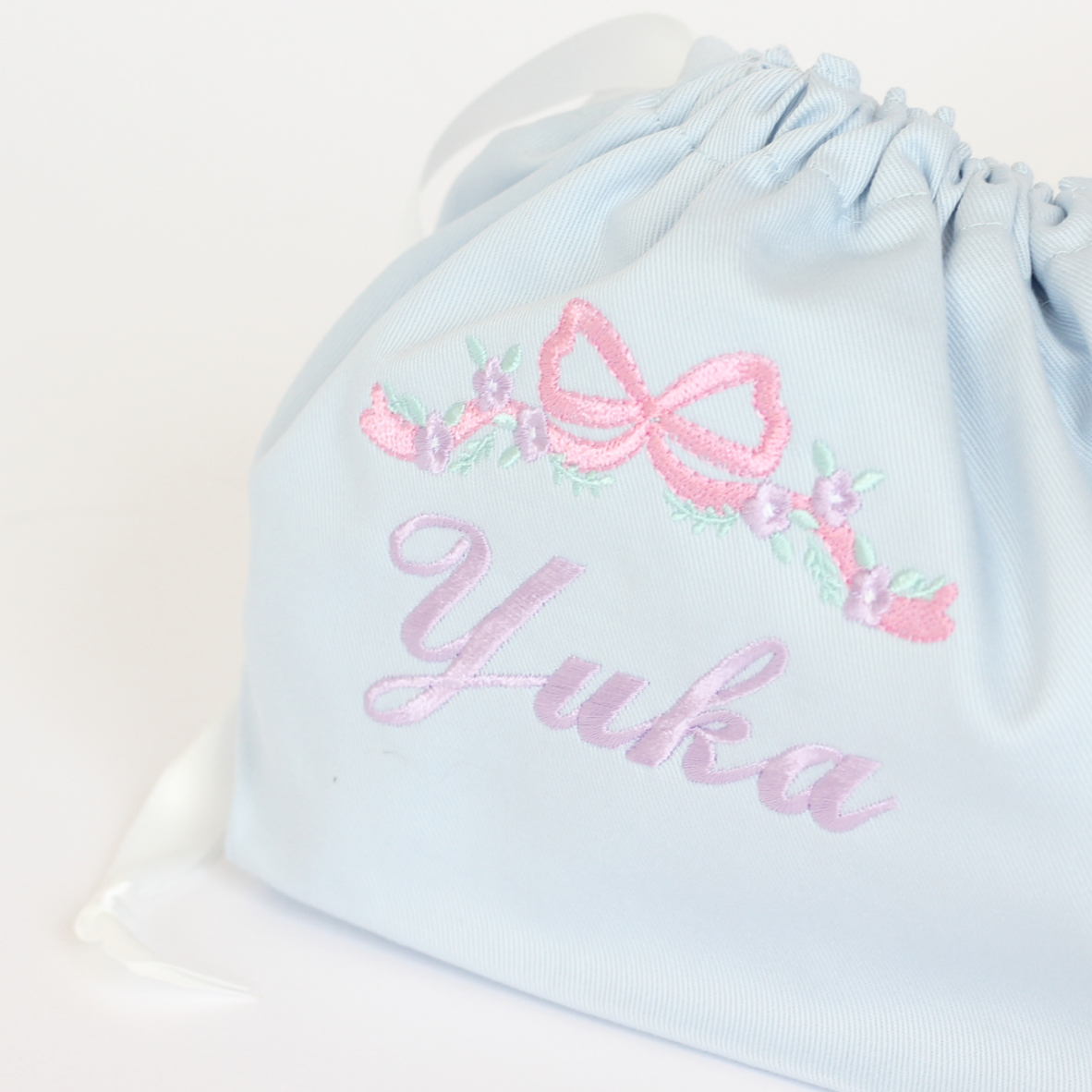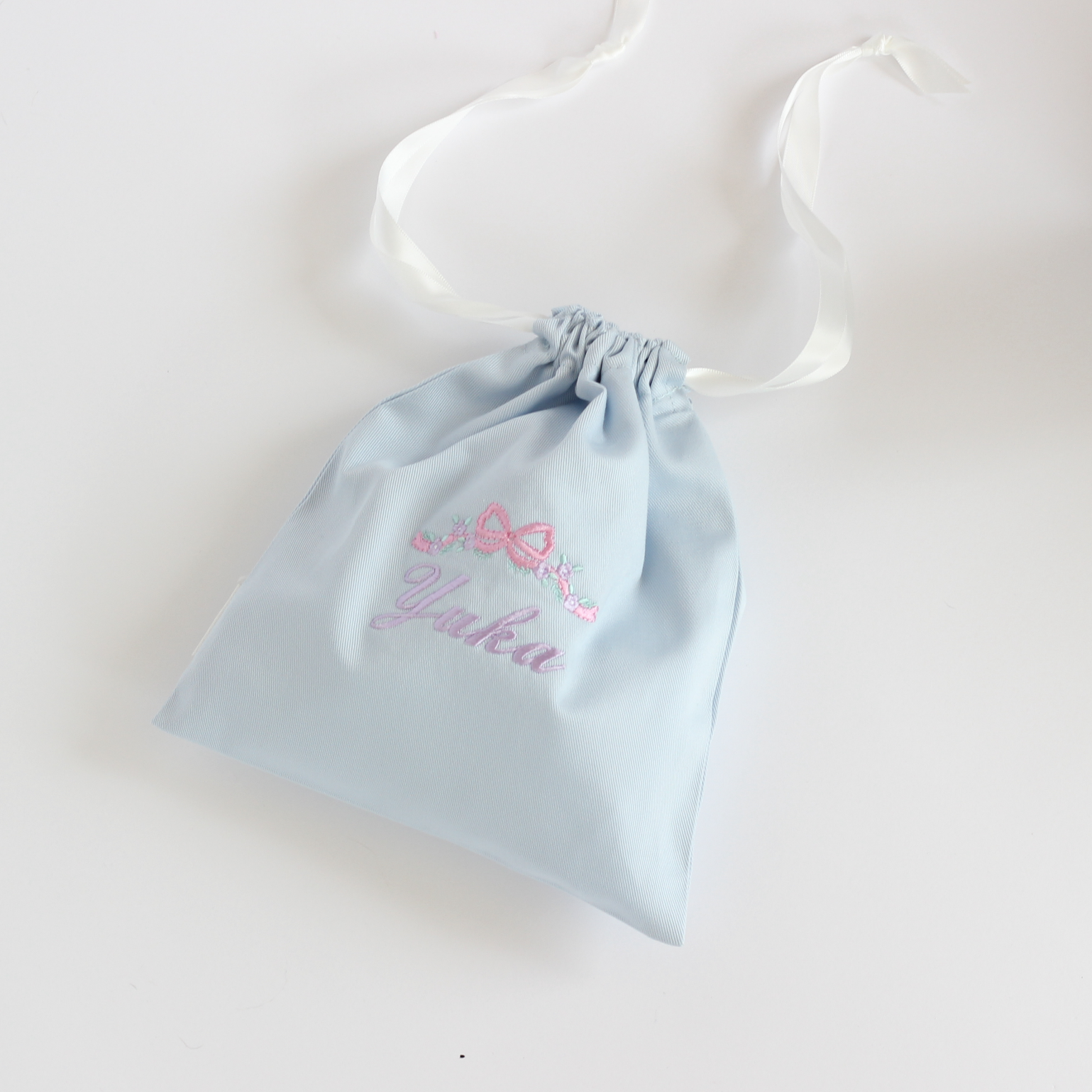 柔らかなツイル生地と両面サテンリボンを通した巾着袋に大きめのおリボンとお花、お名前を刺繍します。