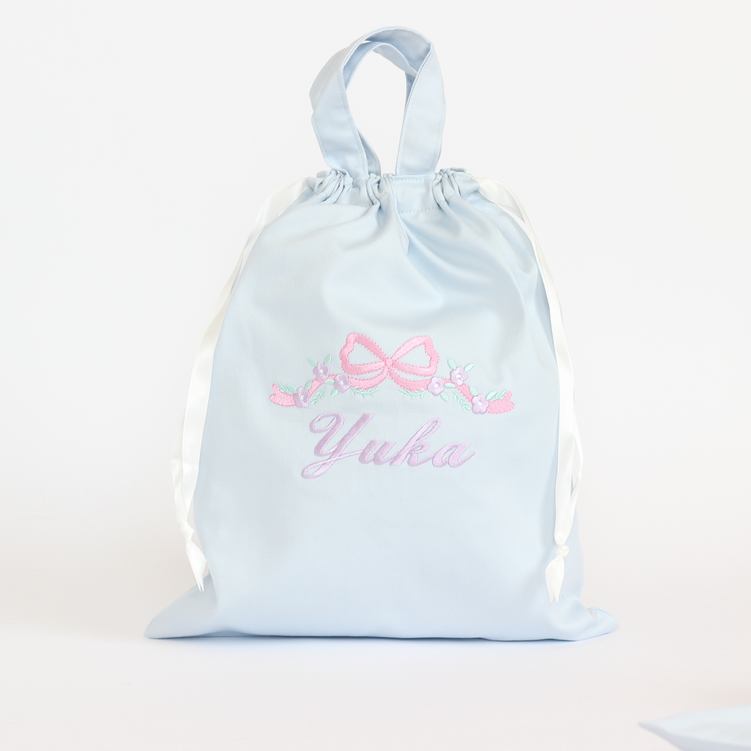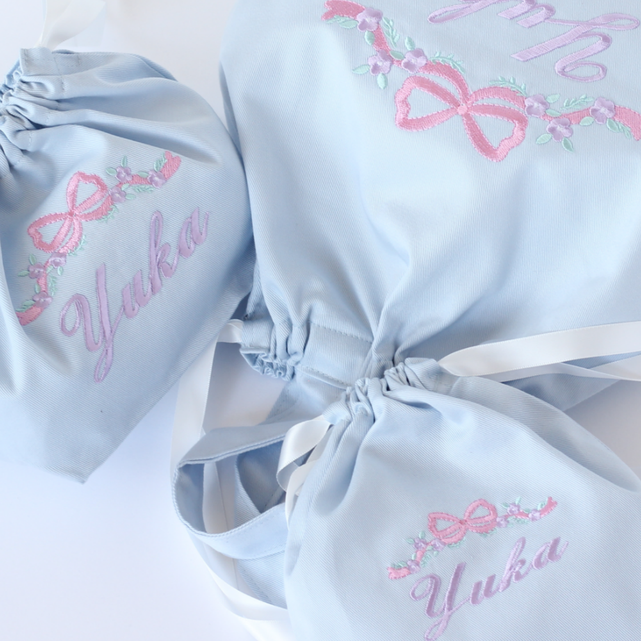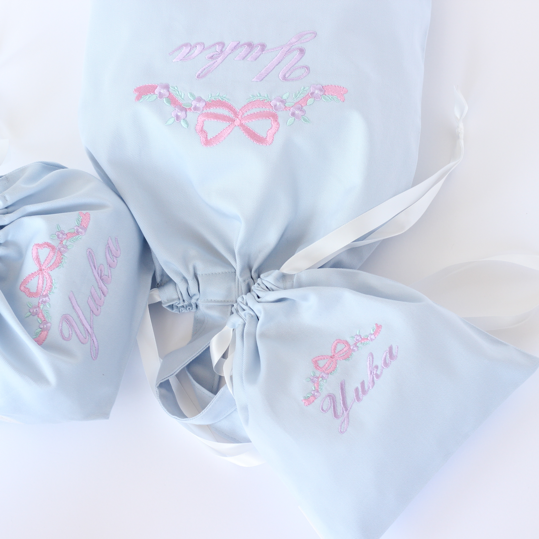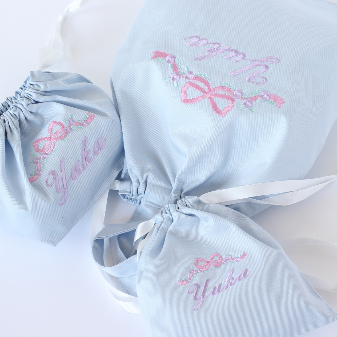 柔らかなツイル生地と両面サテンリボンを通した巾着袋に大きめのおリボンとお花、お名前を刺繍します。