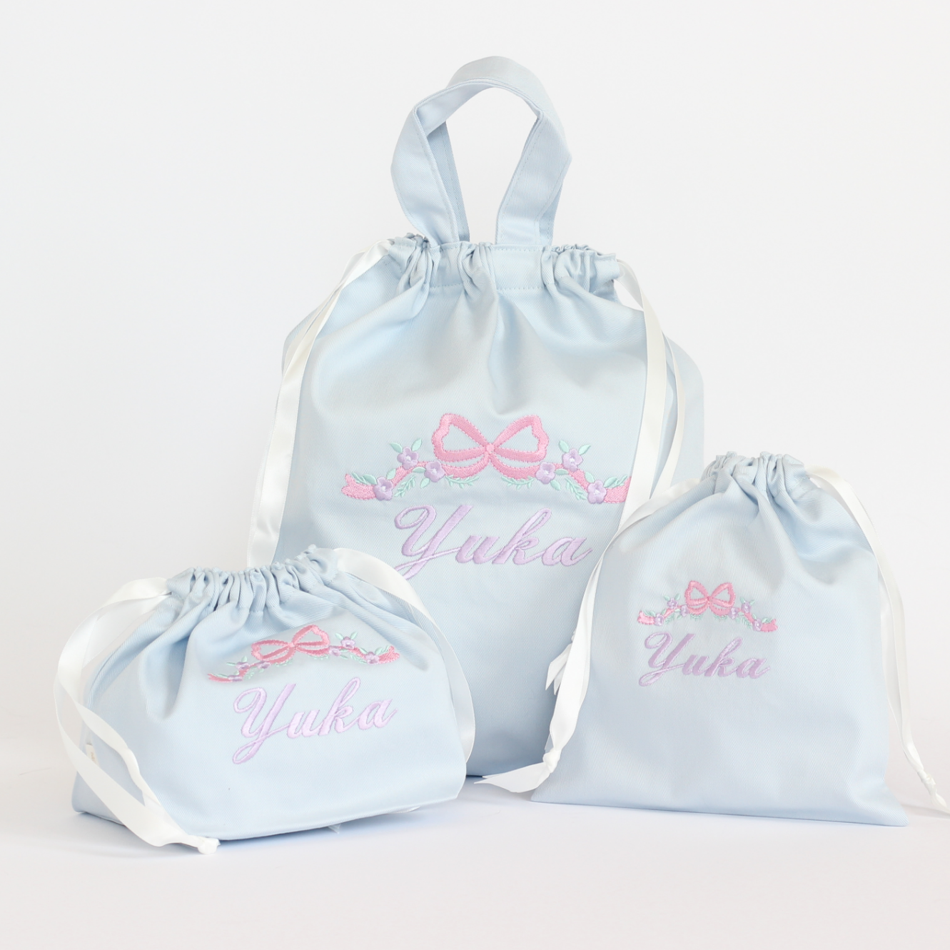 【リボンとお花+名入れ刺繍】巾着袋3種類セット(4色)