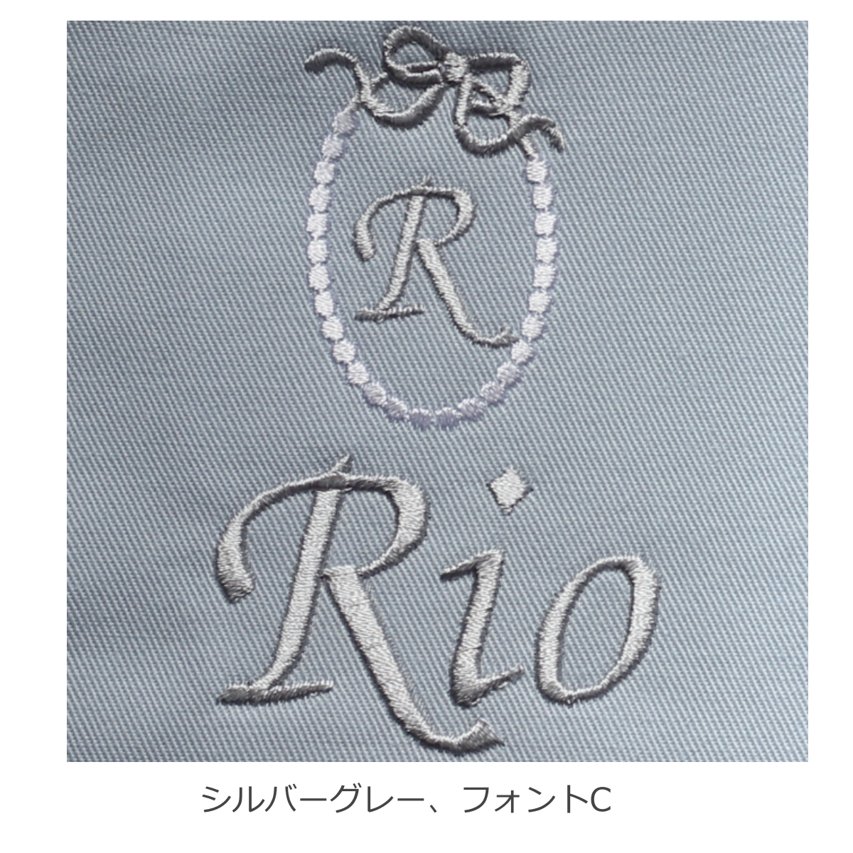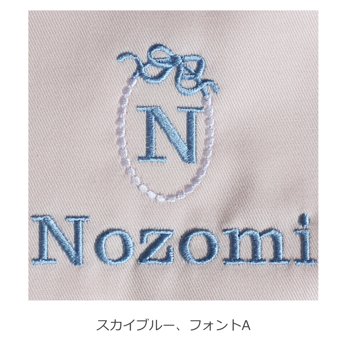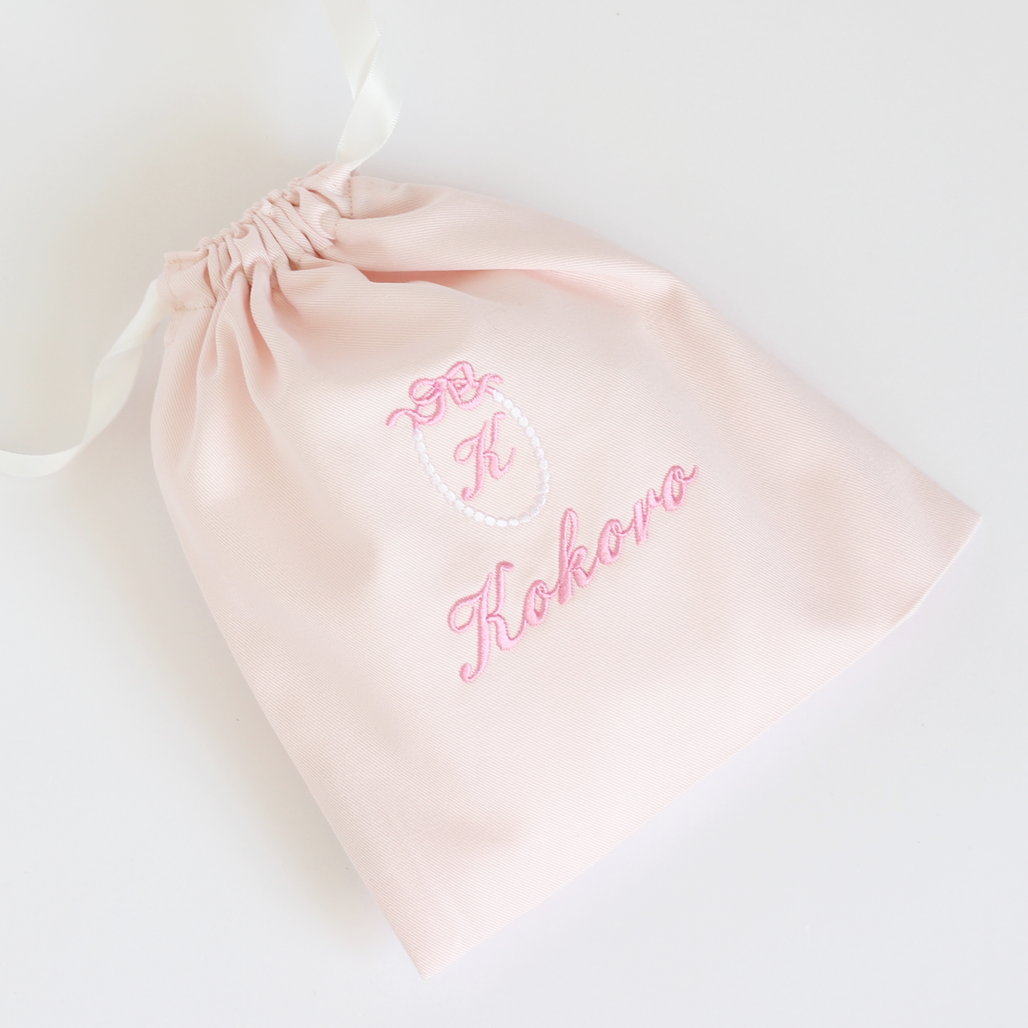 柔らかなツイル生地に両面サテンリボンを通した巾着袋にイニシャルとお名前を刺繍します。大人の方にも使いやすいデザインです。